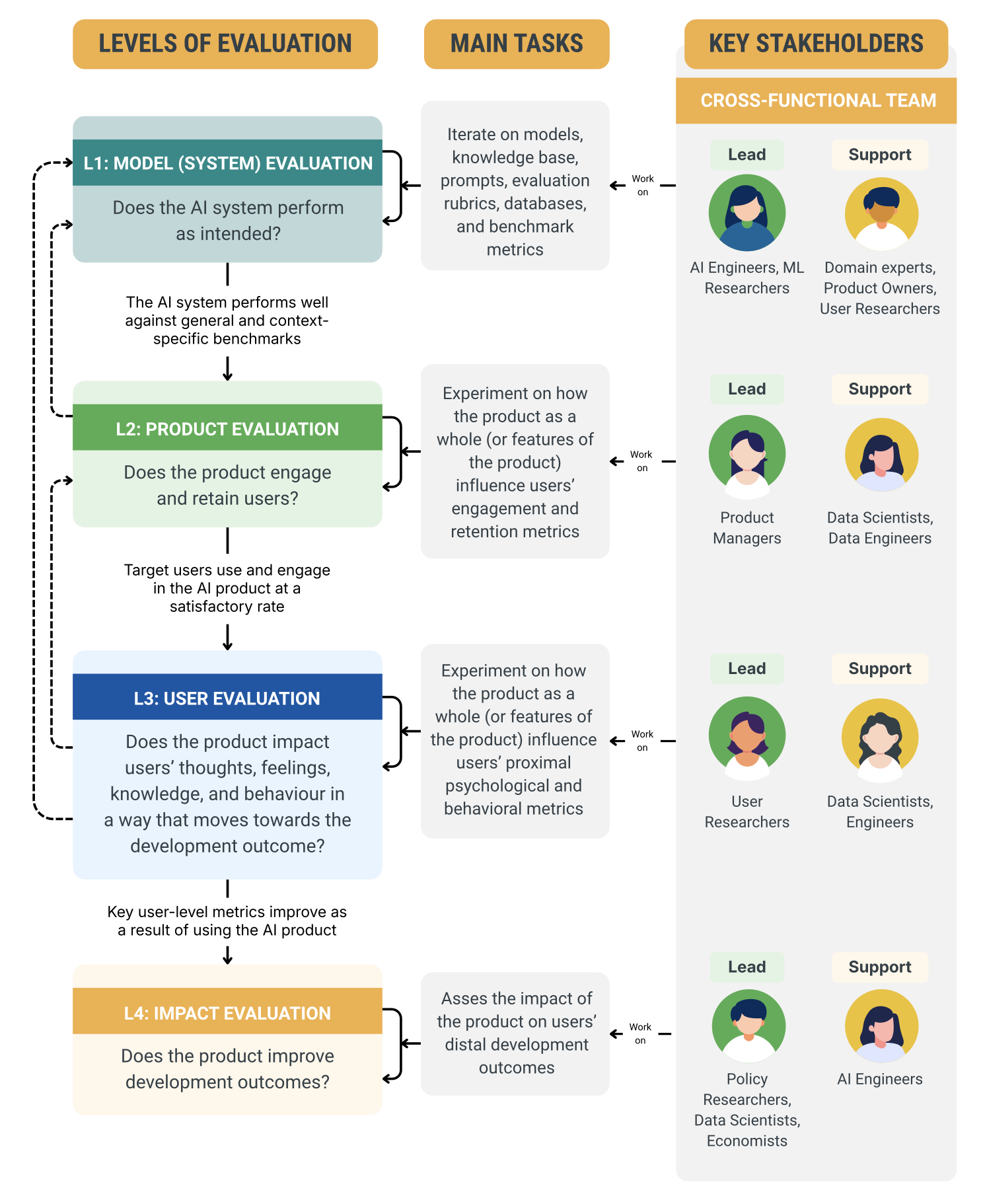 <table data-card-size="large" data-view="cards"><thead><tr><th></th><th></th><th></th><th data-hidden data-card-target data-type="content-ref"></th><th data-hidden data-card-cover data-type="image">Cover image</th></tr></thead><tbody><tr><td><i class="fa-gear-code">:gear-code:</i> </td><td><h4><strong>Level 1 - Model evaluation</strong></h4></td><td>Does the AI system perform as intended?</td><td><a href="../level-1-model-evaluation">level-1-model-evaluation</a></td><td></td></tr><tr><td><i class="fa-box-isometric">:box-isometric:</i></td><td><h4><strong>Level 2 - Product evaluation</strong></h4></td><td>Does the overall product engage and retain users?</td><td><a href="../level-2-product-evaluation/overview">overview</a></td><td></td></tr><tr><td><i class="fa-user">:user:</i></td><td><h4><strong>Level 3 - User evaluation</strong></h4></td><td>Does the product change users’ thoughts, feelings, knowledge, and behavior towards the development outcome?</td><td><a href="../level-3-user-evaluation/overview">overview</a></td><td></td></tr><tr><td><i class="fa-chart-column">:chart-column:</i></td><td><h4><strong>Level 4 - Impact evaluation</strong></h4></td><td>Do users with access to the product improve development outcomes?</td><td><a href="../level-4-impact-evaluation/overview">overview</a></td><td></td></tr></tbody></table>
